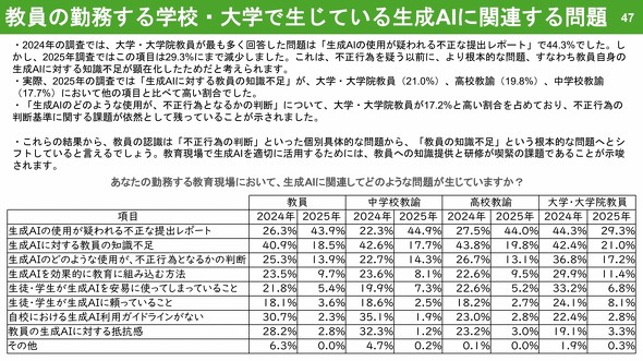 学生のAI利用に関して、学校側がどのように管理し、判断しているのかは重要である。教員に対するアンケートで、教育現場での課題として、興味深い結果が出た。