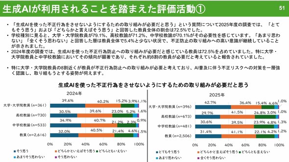 「AIの使用が疑われる不正な提出レポート」に関しては、中学・高校ではかなり増加傾向にある。一方で大学・大学院においては、ほぼ逆の結果となっている。これは、中高では基本的にレポートにAIを使用することが原則禁止されている一方、大学・大学院は寛容になっており、こうしたルールの違いはありそうだ。