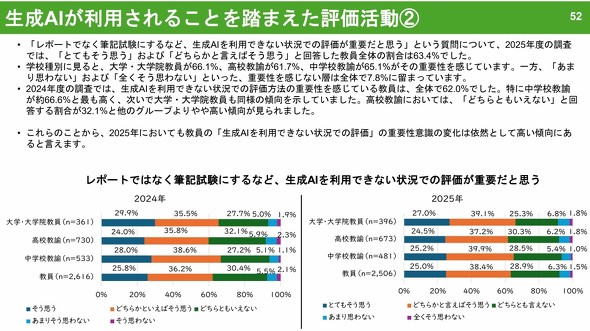 学生にとっては単位が取れればいいので、突出した評価はいらないのかもしれない。ただこうした中でも、AIを駆使して調査範囲を拡大したり考えを整理したりして、より高いレベルにまで到達できている学生も出てきているという。求められるのはこうした使い方ができる人材であり、全員がこのレベルになることが求められる。少なくとも大学以上においては、「AI導入の是非」の時代はあっという間に過ぎて、「どう使うか」の時代に突入したといえる。