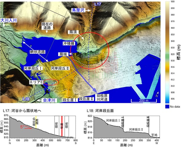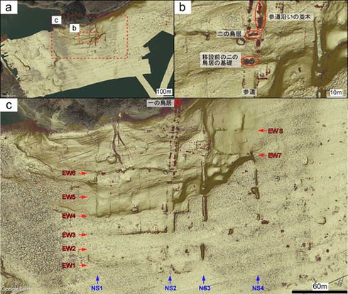深度データからCS立体図(複雑な地形を一目で把握できる地形表現図法)を作成したところ、道路や水路、神社の参道とみられる線形構造が浮かび上がった。磐梯山噴火の前に作られた地図と比較するとそれぞれの位置関係などが一致した。