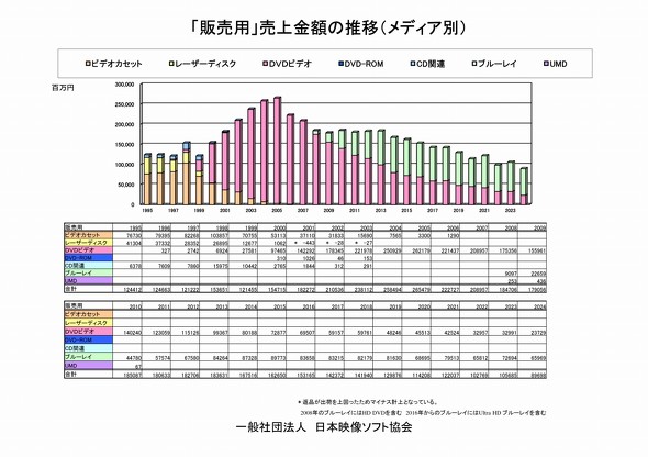 だがセルビデオセールス全体から見れば、収益は下がり続けている。注目すべきは、24年時点でもまだDVDがそれなりにシェアを持っているというところだ。
