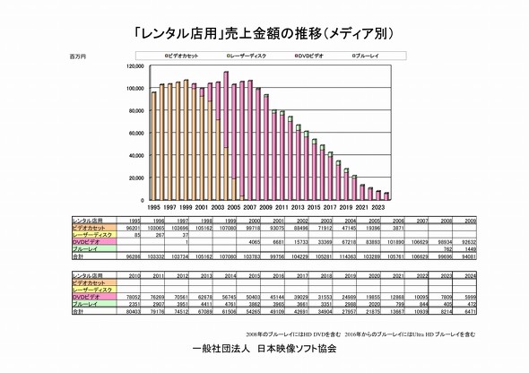 ではレンタルはどうだろうか。こちらもBlu-rayの登場は08年だが、ほとんどBlu-rayは存在感を示せていない。そもそも07年以降は滑り台のようにセールスが下がっている。