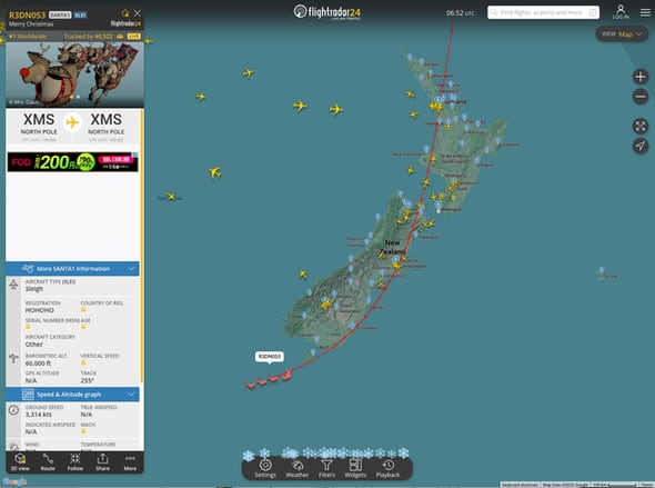 同アカウントは、日本時間の午後4時前に「サンタのそりは高度6万フィートを快適に巡航しながらニュージーランドのクライストチャーチを通過しました」と投稿。一般的な飛行機よりもかなり高い場所を飛行しているため、衝突するような危険はないという。