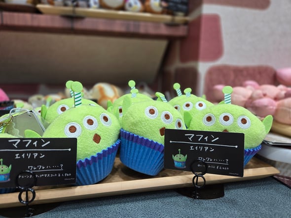 こういう、パン屋をイメージした世界観の売り場も当初から伊藤さんが温めていたアイデア。写真のエイリアン・モチーフの「マフィン」(Sサイズ、2420円)は、硬めのフェルトで出来たカップ部分のリアルさがすごい©Disney思い付いたら、アイデアは数珠繋ぎに出てきたそうで、パンのぬいぐるみという発想の新しさに加えて、ぬいぐるみ売り場でパン屋のようにトングでぬいぐるみを取るといった世界観まで作れたら、ぬいぐるみを買うだけでない体験まで提供できるのでは、と思ったという。