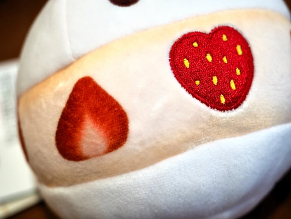 「私が個人的に気に入っているのは、『マリトッツォ』の苺を、真ん中は刺繍にして、その他はプリントにしたところだったりします。全部刺繍でやっちゃうと見た目が重くなるというか、見ていて疲れちゃうと感じました。転写の部分と刺繍の部分のバランスをとってあげると高級感もあるし、つくり込みのバランスも良くなるかと思っています。モチーフが食べ物なので、そういうバランスは気をつけています」と伊藤さん。