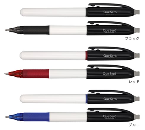 同社とぺんてる、プラスの文具メーカー3社が共同開発したインク「Que Sera」を採用した新発想のボールペン。インクには、顔料とゴム材が入っていて、乾くとゴム剤が顔料を巻き込み団子状の“皮張り”状態となる。