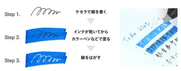 間違えてもきれいに消せる他、剥がして消すという特性を生かしてユニークな使い方ができる。例えばマスキング。文字が乾いてからカラーペンで周囲を塗り、ケセラの筆跡を剥がせば白抜き文字になるなど多彩が表現が可能になるという。