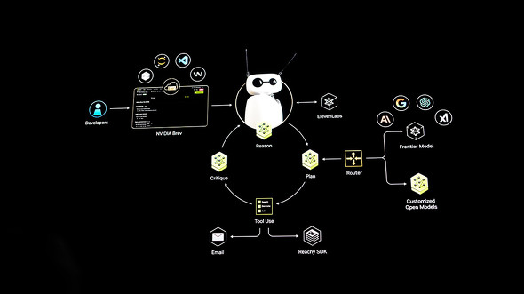 基調講演では、NVIDIAの小型AIスパコン「DGX Spark」を使い、オープンソースロボット「Reachy mini」をパーソナルエージェントとして 動作させるデモ動画を披露した。「NVIDIA Brev」、ElevenLabsの音声AIなどを利用し、タスクに応じてローカルモデルやクラウドモデルにつなげてタスクを実行する。デモでは、Reachyが見たホワイトボードから今日の予定を抽出したり、カメラが捉えたラフのイラストをGrokに投げてイメージ生成したり、外出先から家のReachy miniにチャットで ペットの様子などを尋ねるシーンなどが映し出されていた。