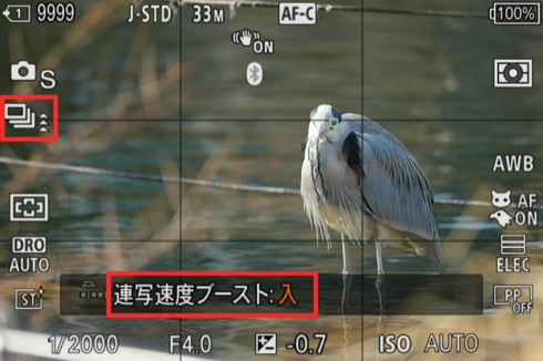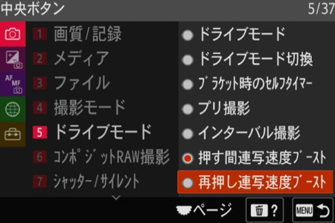 私はとっさに押しやすい場所がいいと思い、中央ボタン(十字キーの真ん中のボタン)に割り当ててみた。押すと「連写速度ブースト」がオンになり、高速連写に切り替わる。