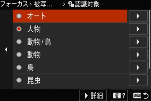 α7 IVの被写体認識AFは人物と動物と鳥だけだったが、その後、AIを使った被写体認識AFが発展し、昆虫、車、列車、飛行機に拡張子、さらに「オート」も追加された。α7 Vもその最新の被写体認識AFを搭載している。