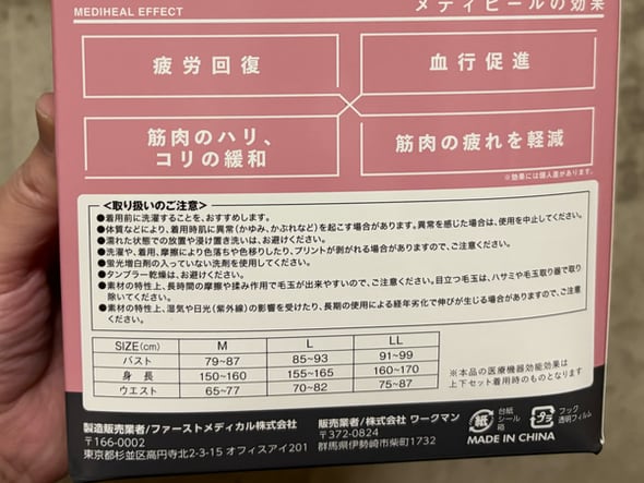 昨年末、たまたま最寄りの「ワークマン女子」に行った時、壁に吊り下げられたメディヒールの箱を見つけた。商品は女性用しかないが、LLサイズの仕様を確認すると、身長170cm、ウェスト87cmまでと、男性でも着られそう。着てみて窮屈だったら家族にあげればいい、ということで思い切って購入した。なお、LLで上下がそろうのは「グレージュ」という色のみだった。