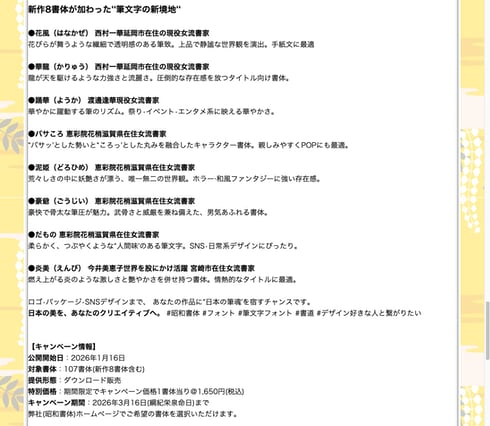 昭和書体は、新作8書体を含む107書体を1書体あたり1650円でダウンロード販売する「史上最大の書体開放キャンペーン」を1月16日に始める。「これまで限られた場面でしか触れられなかった筆文字の魅力を、より多くのクリエイターへ届ける」としている。