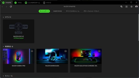 Kiyo V2をPCに接続すると、Razer製デバイスの統合管理ソフトウェア「Razer Synapse」が自動的に起動します。Razerユーザーにはお馴染みのこのソフトウェアから、オートフレーミングやワンクリックでの画像補正、画質の詳細設定などを直感的に行うことができます。