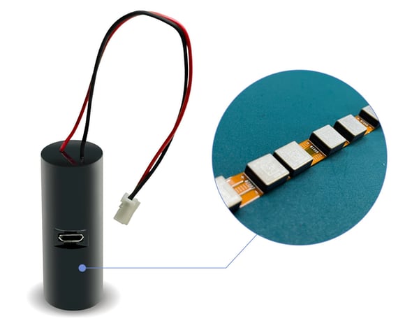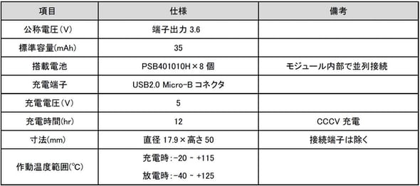 直径17.9mm、高さ50mmというER電池のサイズに、量産品の全固体電池「PSB401010H」を8個搭載。電池電圧を3.6Vに変換し、出力する回路を内蔵した。容量は35mAh、5V充電に対応する。