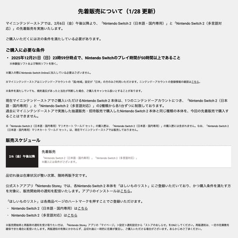 任天堂は1月28日、ECサイト「マイニンテンドーストア」で「Nintendo Switch 2(日本語・国内専用)」と「Nintendo Switch 2(多言語対応)」の先着販売を2月6日から実施すると発表した。