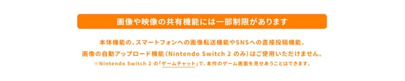 ゲーム公式サイトによると、同ゲームではNintendo Switch本体のスマートフォンへの画像転送機能、SNSへの直接投稿機能、Nintendo Switch 2の画像自動アップロードといった機能は利用できない。Switch 2の「ゲームチャット」で、本作のゲーム画面を見せ合うことはできる。