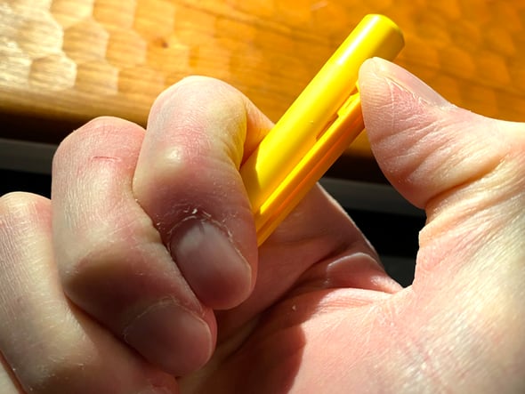 エアステップは尻軸にノックボタンはなく、クリップ部分を押し下げて芯を出す「クリップスライドノック式」を採用している。この操作は、「フリクションボール」や、多機能ペンを愛用している方には既にお馴染の操作だと思うが、シングルタイプのシャープペンシルでは、まだ珍しいかもしれない。ともあれ、クリップを押し下げるとペン先からパイプが出てくるので、もう一度押し下げてパイプの先に芯を露出させる。これで準備は完了。あとは、普通に書く。
