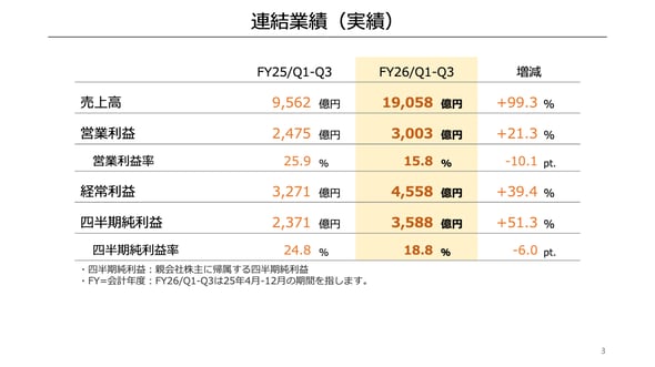 26年3月期第3四半期決算(25年4月〜12月31日)は、売上高が前年比99.3%増の1兆9058億円、経常利益は同39.4%増の4558億円、純利益は51.3%増の3588億円の増収増益だった。