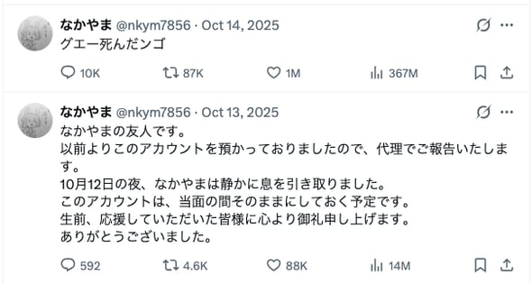 辞世のX「グエー死んだンゴ」3億表示超え、「香典包んだンゴ」で寄付2万件超 「成仏してクレメンス」ムーブメント続く