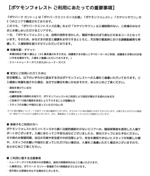 「ポケパークカントー」(出典:ポケモン社)©2026 Pokemon. ©1995-2026 Nintendo/Creatures Inc./GAME FREAK inc. ポケットモンスター・ポケモン・Pokemonは任天堂・クリーチャーズ・ゲームフリークの商標です。ポケモンフォレストは自然の地形を生かし、階段や急な上り坂などのあるコース。このため当初は「酒気を帯びている方」や「妊娠中の方」「心臓に疾患をお持ちの方」などに加え、「車いすまたはベビーカーをご利用の方」や「高血圧または低血圧の方」も入場できないとしていた。