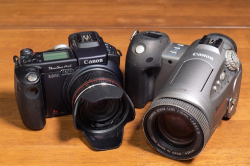 Proと名が付くことから分かるように、フラッグシップモデルで、他より大きなセンサー、高倍率のズームレンズ、独特のスタイリング。一番ユニークなボディを持っていた「PowerShot Pro 70」(98年)は残念ながら手元にないので、その後に出た「PowerShot Pro90 IS」と、最後のモデルとなった「PowerShot Pro1」を。PowerShot Pro1は当時(04年)としては最高レベルの2/3型800万画素CCD搭載で28-200mm相当のLレンズを搭載したハイエンド機だったが、後継機はなかった。