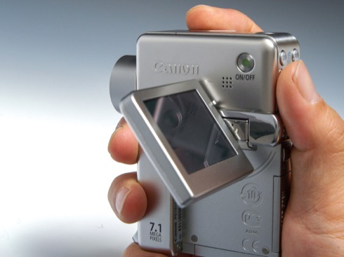 1代限りで終わってしまったPowerShotもあった。07年の「PowerShot TX1」である。これがまた面白くて、縦長でモニターを開いて撮るのがデフォルトというスタイル。シャッターボタンは上にあり、写真のようにレンズの下に指をいれて握って撮るという。レンズの奥行きを取れるので当時としては高倍率な7.1xのズームレンズを搭載。