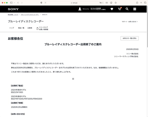 ソニーは2月9日、Blu-ray Discレコーダー全モデルの出荷を順次終了すると発表した。理由について同社は「動画配信サービスの普及や見逃し配信コンテンツの増加といった影響により、レコーダーによる録画需要が大きく減少しているという市場環境や今後の市場の成長性を鑑みたもの」と説明した。