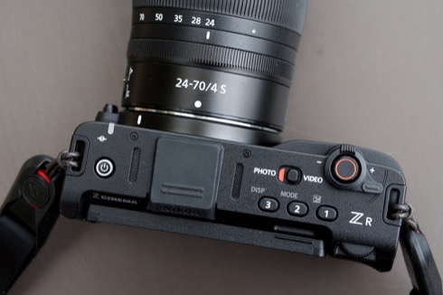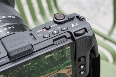 Zシリーズ、というかニコンのデジタル一眼ではシャッターボタン回りに電源レバーが置かれるのが通例だが、ZRではそこにズームレバーがあり、電動ズーム(PZレンズ)時はズーミングに、それ以外では拡大表示に使われる。