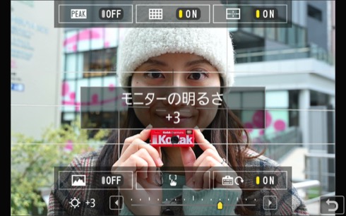 気になるモニターの輝度だが、タッチパネルを使ってその場でさっと明るさを変更できるのでよい。最高に明るくすれば屋外でもokだ。
