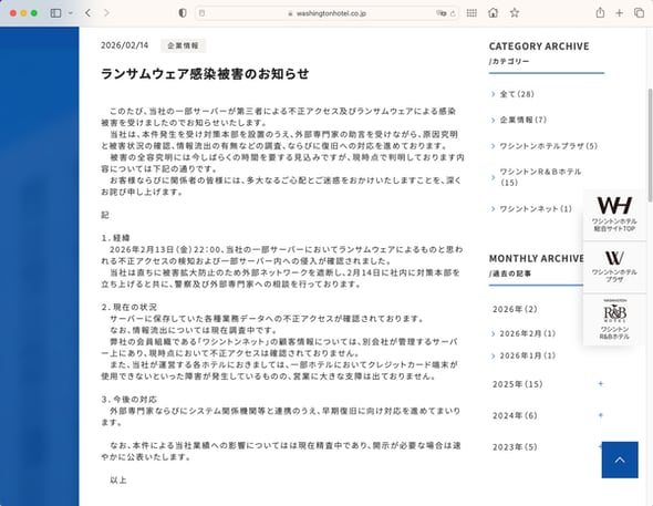 全国43ヵ所のホテルを運営するワシントンホテル(愛知県名古屋市)は2月14日、一部業務用サーバーへの第三者による不正アクセスとランサムウェア感染を確認したと発表した。被害状況の確認と復旧対応を進めているが、被害の全容究明には「今しばらくの時間を要する」としている。