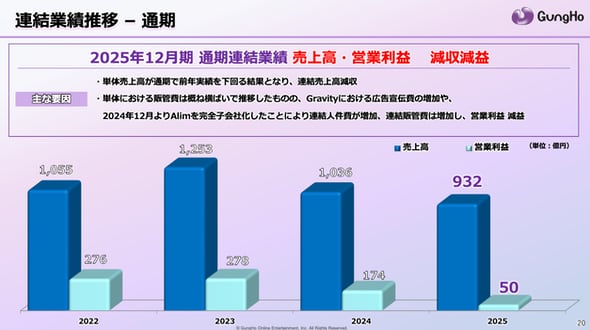 「パズル&ドラゴンズ」(パズドラ)などのスマホゲームで知られるガンホー・オンライン・エンターテイメントが2月13日に発表した2025年12月期通期連結決算(25年1月〜12月)は、売上高が932億4200万円で前年比10.0%減、営業利益は50億5600万円で同71.1%減、純利益は14億700万円で同87.4%減と大幅な減収減益となった。