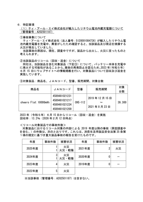 火元と思われる製品は「cheero Flat 10000mAh」。19年12月15日〜21年8月23日にかけて3万9300台が販売された。バッテリー本体の充電中に発火する可能性があったことから、リコールを開始。すでに2年半以上たつが、26年2月12日時点での回収率は13.2%となっている。