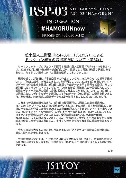 ハモるんも、まもなく大気圏へ再突入すると予想されたが、一方で宇宙で作曲した楽曲データを地上でダウンロードし、一般向けに公開するといったミッションも相次いでクリア。公式Xアカウントは10日、「地球に還る日を前に、続々とサクセスクライテリアを達成していく超小型人工衛星RSP-03"ハモるん」と誇らしげにポストしている。
