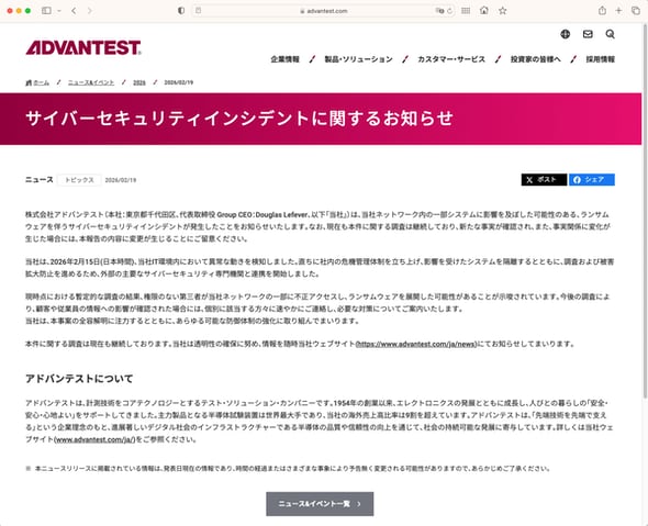 アドバンテストは「本事案の全容解明に注力するとともに、あらゆる可能な防御体制の強化に取り組む」としている。