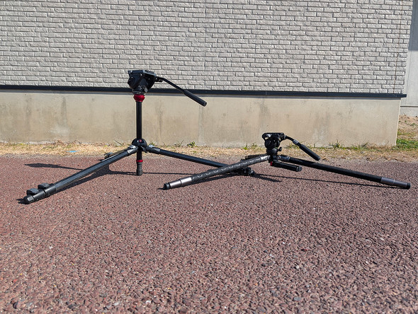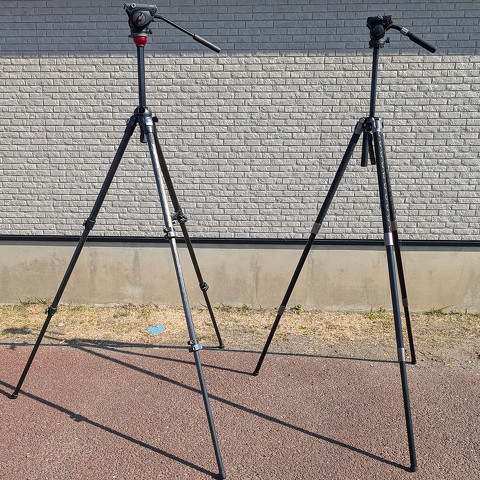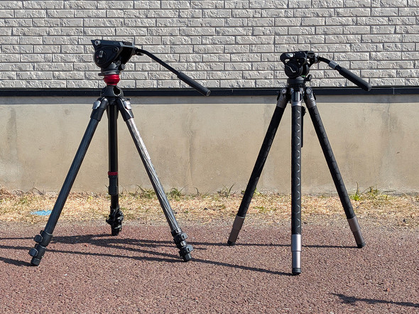 一方で最低高はかなり異なる。このタイプの三脚は、脚部をめいっぱい開いてもセンターポールがあるために、最低高が下げられないというデメリットがある。実際同じようにセッティングしても、数センチの高さの差はそのままだ。