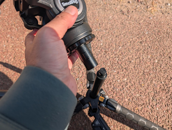 センターポールを外すと、ほぼヘッド部の高さだけになるので、ハイハットによる撮影とほぼ同等の高さまで下げられる。いちいちネジを外すは面倒ではあるが、ネジは完全に外れるわけではなく、緩めても脱落しないようになっている。このあたりも細かい配慮が伺える。