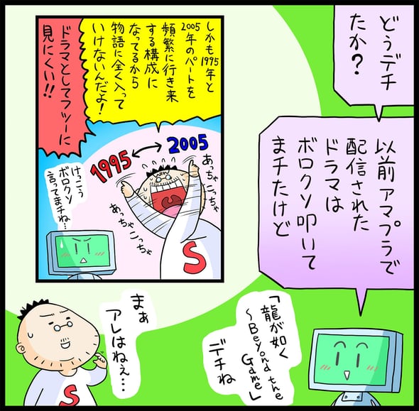 何より、低予算でもアイデアと元の作品への理解があれば良作が作れることを改めて示してくれたことが、ボクはとてもうれしいです。何でもアリな龍が如くの世界観があってこそ成り立つとはいえ「セットが作れないほど予算がないならゲーム画面を使えばいいじゃない!」という開き直──もといアイデアが、ゲーム実写化のハードルを下げるヒントになればいいな、などと考えています。