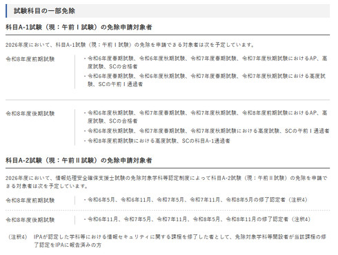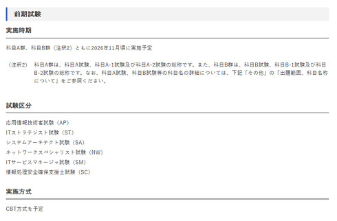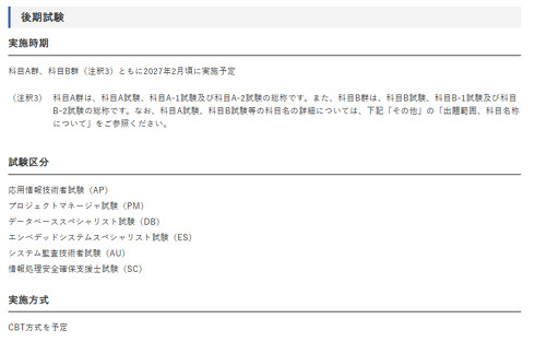 いずれの試験も出題範囲や形式、問題数、試験時間に変更はない。従来、科目名「午前試験」だったものは「科目A試験」に、「午後試験」は「科目B試験」などに変更予定。試験日については、一定期間内に複数日を設ける予定で、科目A群と科目B群は実施期間を分けるという。
