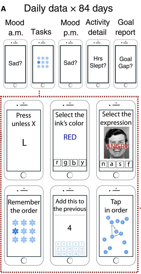 大学生184人が12週間にわたり、毎日スマートフォンで6種類の短い認知課題(各1〜2分でこなせるもの)をこなした。合わせて毎晩、翌日の目標(数学の宿題を終わらせるなど)を2つ立て、翌日の終わりにその達成度を自己報告した。気分や睡眠、労働時間、動機付けなども毎日記録した。