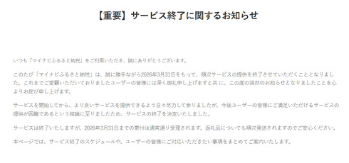 新規寄付の受け付けは3月31日まで。それ以前の寄付は通常通り受理され、返礼品も順次発送する。その後、寄付金控除に関する証明書のダウンロードは4月20日まで、マイページの閲覧は4月30日まで、問い合わせの受け付けは9月30日まで、それぞれ対応する予定だ。