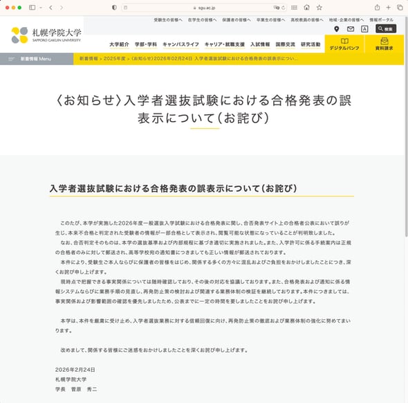 札幌学院大学(札幌市厚別区)は2月24日、入学者選抜試験の合否発表サイトの誤表示について菅原秀二学長名で謝罪した。不合格の受験生にも「合格」と表示され、閲覧可能な状態になっていた。