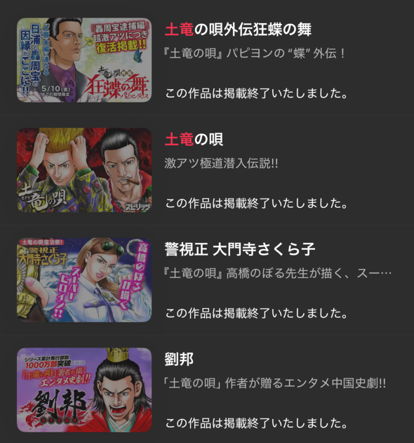 他にも「機動警察パトレイバー」「MAJOR」「土竜の唄」「アオイホノオ」「吼えろペン」といった作品が同様の状態になっている。小学館によれば、すでに漫画を購入しているユーザーでも、エピソード単位で買った場合は読めない状態という。今後の返金対応については検討中としている。単行本単位で購入した場合は引き続き閲覧できる。