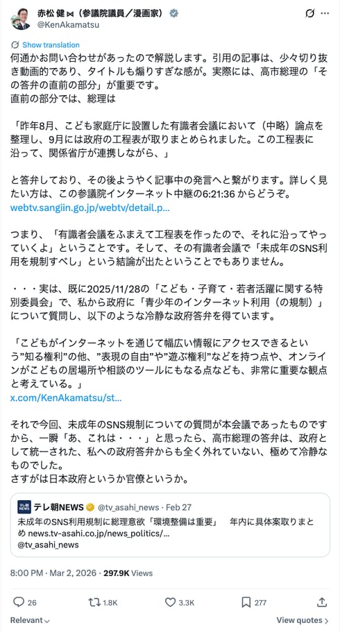 テレビ朝日が2月27日に報じた「未成年のSNS利用規制に総理意欲『環境整備は重要』年内に具体案取りまとめ」というニュースについて、参議院の赤松健議員、山田太郎議員が相次ぎX上で苦言を呈した。記事は「少々切り抜き動画的であり、タイトルも煽りすぎ感が(ある)」(赤松議員)としている。