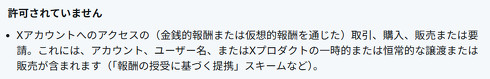 なおXの利用規約では、Xアカウントを金銭によって取引することを許可していない。違反した場合、X社によってアカウントにペナルティーが与えられる可能性がある。