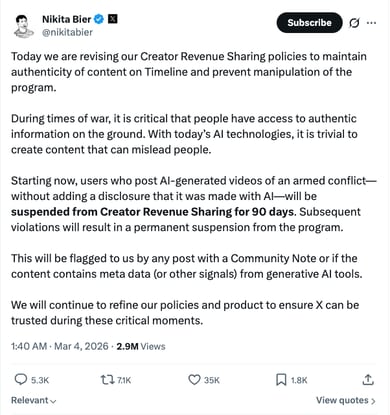 Xは3月4日、クリエイター収益分配ポリシーを改訂すると発表した。AIで生成した武力紛争に関連する動画をAI生成と明かさずに投稿したユーザーには収益分配を90日間停止する。
