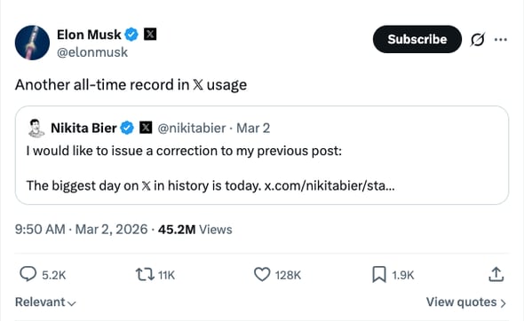 米国とイスラエルは、2月28日にイランに対して大規模な攻撃を実施し、その後イランの最高指導者だったハメネイ師を殺害した。そうした状況の中で情報を求める人が急増し、Xの通信トラフィックは増大。ビア氏は3月1日に「今日はX史上最大の日だった」と投稿したが、翌2日に「今日がX史上最大」(ビア氏)と訂正している。