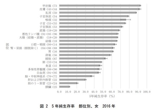 男女別では、男性の5年生存率が比較的高い(70-100%)部位は、前立腺と甲状腺、皮膚、乳房、喉頭だった。女性では5年生存率が比較的高い部位(70-100%)は、甲状腺と皮膚、乳房、子宮体部、喉頭、子宮頸部に。両性別ともに生存率が比較的低い(0-29%)部位は、胆のう・胆管、膵臓となった。