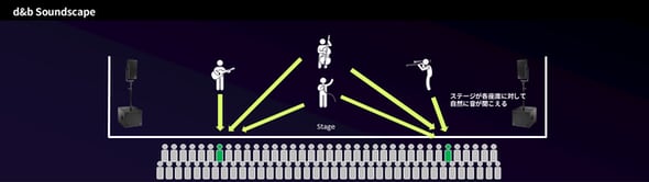 d&b Soundscapeは、ニューヨークのブロードウェイやロンドンのウエストエンドなど世界各地の劇場やコンサートホールでも採用されているイマーシブサウンドシステム。専用の信号処理エンジンを用い、ステージ上のパフォーマーの位置情報に合わせた信号処理をリアルタイムに行うことで、どの客席も「視覚と聴覚が自然に一致したリスニング体験を実現できる」としている。