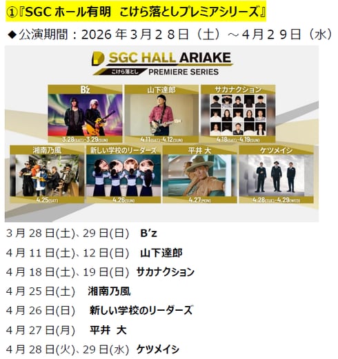 SGCホール有明では、3月28日から「こけら落としプレミアムシリーズ」として、B'z、山下達郎、サカナクションなど著名アーティストの公演を予定している。