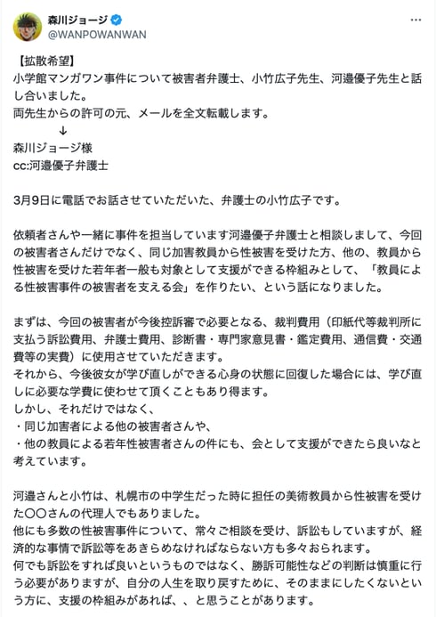 漫画家の森川ジョージさんは3月11日、小学館「マンガワン」事件を受け、「教員による性被害事件の被害者を支える会」を作ると明らかにした。被害者の担当弁護士である東京共同法律事務所の小竹広子さん、河邉優子さんと連名で公表した。